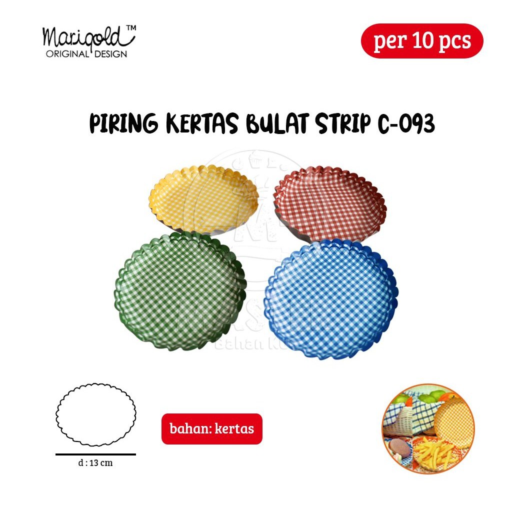 Marigold Piring Bulat Aneka Strip C-093 diameter 13cm [per 10 pcs]Dijual Per 10 pcsDiameter 13 cmvarian warna:MerahBiruKuningHijauBarang dikirim sudah dalam kondisi dirangkai/dibentuk sehingga bisa langsung digunakan.Piring bulat digunakan sebagai tempat snack atau cake dan juga dapat digunakan sebagai tempat lauk kering tak berkuah untuk selamatan.#piring #piringkertas #wadah #piringbulatpanda #piringbulat #tempatsnack #tempatcake #snack #cake #kue #merah #biru #kuning #