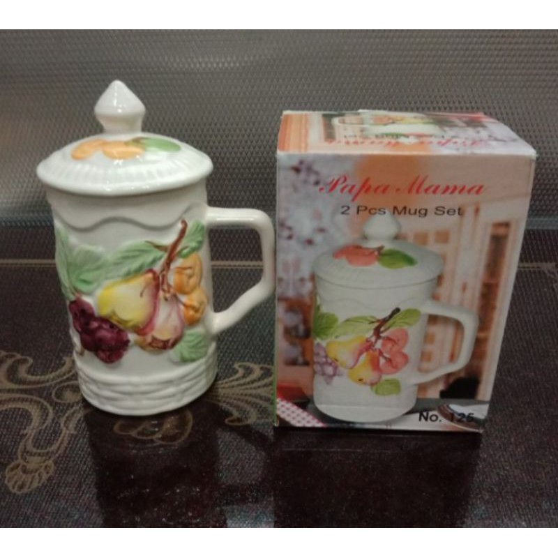Mug papa mama keramik + tutup motif timbul , bahan keramik tebal motif timbul membuat kesan menarik Mug model tinggi , dengan ukuran tinggi mug =13,5 cm ; diameter =8,5 cmkemasan box pxlxt ( cm )11,5x10,5x15,5Packing kardus dan bubble f