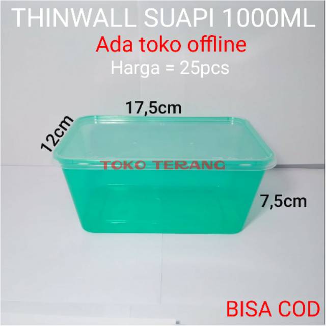 Thinwall SUAPI 1000ML (REC) WARNA▪︎Food grade▪︎Tutup rapat▪︎Bisa dikukus▪︎Bisa freezer▪︎Bisa microwave▪︎Tahan sampai 100°C《 Harga dapat 25pcs 》¤ Warna:> HijauTambahkan packing kardus untuk meminimalkan kerusakan pada saat di ekspedisi, "packing kardus" bisa dicari di etalase.Ketentuan toko* Barang yang sudah dibeli tidak dapat ditukar atau dikembalikan dengan alasan apapun.* Kerusakan yang disebabkan oleh ekspedisi bukan tanggung jawab kami.* Sebelum dikirim barang sudah dihitung dan dipacking dalam keadaan tidak pecah.* Tambahan kardus bukan jaminan barang anda akan sampai dalam keadaan 100% tidak akan pecah, tetapi melakukan tindakan pencegahan pecah t