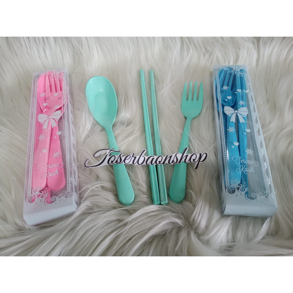 deskripsi HARGA UNTUK 1(SATU) PCS - berbahan PLASTIK- Setiap Set sudah Di Kemas Mika Motif- Panjang Sendok & Garpu Kurang Lebih 16cm- Panjang Sumpit 18cm- Warna Sendok Bervariasi dikirim random sesuai stock- Tidak Bisa request warna tertentu Ketentuan Order- Minimal Order 50pakai stiker ucapan min. 10