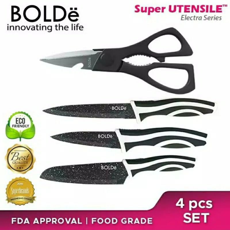 Deskripsi PIsau set 3+1 BOLde super utensil electra - knife set - gunting ori3+1pc electra series - Good Quality Utensil Products.- FDA Aprroved.- Food Grade Technology yang ramah lingkungan dan tidak mengandung bahan kimia berbahaya.- BEIGE Color Luxury Design.- Mudah dibersihkan.- Pisau Set dengan coating bahan granite.- Handle dengan bahan Nylon.- Premium Quality Grade yang sangat nyaman digunakan untuk aktivitas memasak.Kelengkapan Paket:- 1 Fruit Knife (Pisau Buah, Panjang 19,5 cm).- 1 Cutter Knife (Pisau Potong, Panjang 23,5 cm).- 1 Meat Cleaver (Pisau Pemotong Daging, Panjang 24, 6 cm).- 1 Scissor (Gunting Dapur, Panjang 20