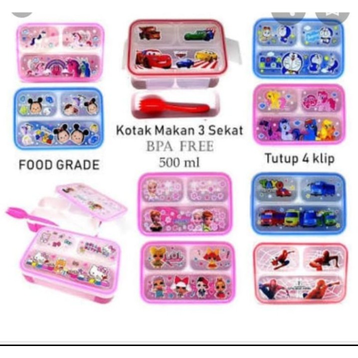 Ready - Ditutupnya terdapat karet antar sekat, sehingga makanan tidak bercampur- Bahan plastik tebal BPA Free- Tahan panas sampai 120 degC- Dilengkapi sendokKelebihan:1. Terbuat dari bahan yang berkualitas untuk makanan, aman dan tidak membahayakan2. Tidak berbau plastik bahkan menggunakan air mendidih di dalamnya4. Bahan berkualitas yang tahan terhadap panas atau dingin5. Dapat digunakan untuk pemasanan menggunakan microwave, menyimpan pada kulkas, dan mesin cuci piring (Dishwasher)6. Tahan panas sampai 120 DegCAsliii.. Ini LUCU banget!Ukurannya kecil & gampang di bawaCOCOK banget untuk anak-a